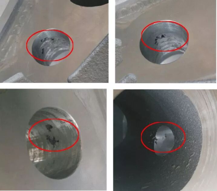 主要的表現(xiàn)特征為尺寸較大,可達到幾毫米,一般為圓形、團球形或扁球形,位于鑄件上部,彌散的分布在內(nèi)澆道的鑄鐵件橫截面積中。內(nèi)澆道作用區(qū)是指澆注時從內(nèi)澆道流出的金屬液流進入型腔中后,其流速方向改變和衰減的區(qū)域。裹挾在液流中的氣泡,隨液流進入型腔金屬液中后,主要分布于內(nèi)澆道作用區(qū)內(nèi),機加工后暴露出來的,局部彌散分布的裹攜氣孔。